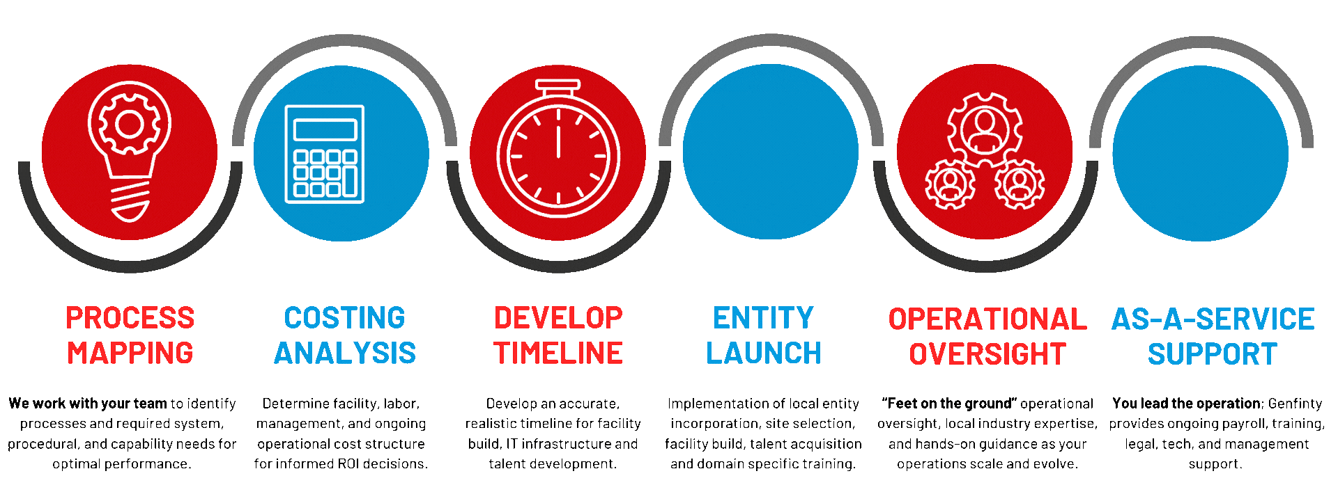 Many Build Operate Transfer (BOT) initiatives fall short of full realization, mainly due to incomplete process understanding and mapping, improperly skilled/trained resources and higher than initially expected Transfer costs. Genfinity’s hands-on, operationally experienced consultants and project management resources work closely with your management team to fully understand and map out your processes and operating structure. This approach ensures that we properly design and custom Build to your specific parameters, identify, train and Employ (on your behalf) the specific resources that operate under your control with our consistent oversight and Support framework. With all of Genfinity’s support services provided in an As-A-Service operating environment, Transfer occurs on a function-by-function basis as your entity matures to absorb and bring them in-house.